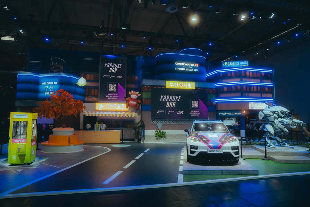 Concepto de stand interactivo: la experiencia del universo de Overwatch 2® de cerca Inspirado en el hogar del personaje del juego D.Va – la ciudad costera surcoreana de Busan – el stand de exposición combina una experiencia inmersiva en un ambiente coreano con elementos interactivos. Por ejemplo, hay un área para karaoke – un pasatiempo competitivo popular en Corea – así como una para jugar, por supuesto.