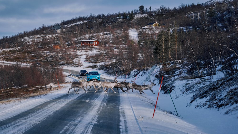 Cuatro modelos eléctricos se dirigen hacia el amanecer ártico. Se trata de dos