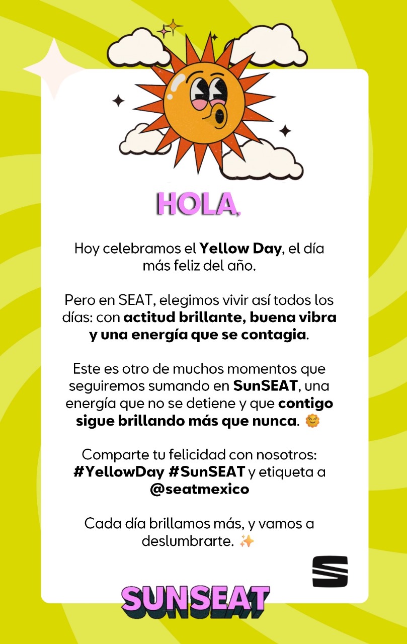 Yellow Day y SunSEAT: la alegría también se conduce La celebración del Yellow Day refuerza el mensaje que SEAT lanzó con SunSEAT, una campaña que marca una nueva etapa para la marca en México. Ambas iniciativas dialogan entre sí desde la luz, el color y el movimiento, apostando por una visión de futuro dinámica, emocional y sustentable.